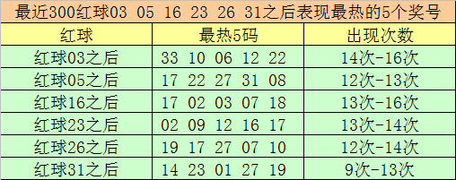 红球冷码统计:双色球第2025097期开出红球奖号辞别为:03、05、16、23、26、31,在最近300期开奖中,各号码出现之后其下期出现最少的5个红球辞别为: ![]() 红球03之后最冷5码为:16、30、05、21、29; 红球05之后最冷5码为:29、28、32、04、12; 红球16之后最冷5码为:01、10、13、15、19; 红球23之后最冷5码为:28、05、31、13、15; 红球26之后最冷5码为:31、04、14、28、05; 红球31之后最冷5码为:10、09、15、25、33; 在以上冷码中,出现1次的冷码有:01、09、12、14、16、19、21、25、30、32、33; 出现1次以上的冷码有:04、05、10、13、15、28、29、31; 双色球第2025098期红球绝杀10码:06 09 10 14 16 17 21 22 23 33。 ![]() 红球03之后最热5码为:33、10、06、12、22; 红球05之后最热5码为:17、22、27、31、08; 红球16之后最热5码为:17、02、03、07、18; 红球23之后最热5码为:02、09、12、16、17; 红球26之后最热5码为:19、17、27、07、10; 红球31之后最热5码为:14、23、01、27、19; 在以上热码中,出现1次的热码有:01、03、06、08、09、14、16、18、23、31、33; 出现1次以上的热码有:02、07、10、12、17、19、22、27; 双色球第2025098期15码大复式参考:01 02 08 11 12 13 15 18 19 25 26 27 29 31 32 双色球第2025098期10码小复式参考:01 08 12 13 15 18 19 25 26 31 红球双胆参考:19、26 上期开出蓝球号码14,该号码在最近300期中出现了19次,其下期辞别开出:蓝球05出现3次,蓝球01、06、15出现2次,蓝球04、07、08、09、10、12、13、14、16出现1次,蓝球02、03、11出现0次。本期五码蓝球参考01、05、07、13、15,独蓝温文01。 ![]() 大飞双色球第2025098期大复式保举:01 02 08 11 12 13 15 18 19 25 26 27 29 31 32 + 01 05 07 13 15 第2025098期缩水小复式保举:01 08 12 13 15 18 19 25 26 31 + 01 07 第2025098期6+1保举:01 08 13 19 25 26 + 01 [扫码下载app,中过数字彩1千万以上的各人齐在这儿!] ![]() |